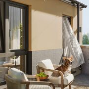 - Территория двора сохраняет концепцию закрытой территории без автомобилей и парковок. Ограждение еврозабором высотой 1,6 м. Видеонаблюдение дворовой территории и по периметру группы домов.