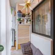 Балкон с остеклением в пол, оборудованный местом для отдыха и хранением.
