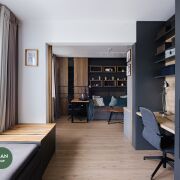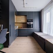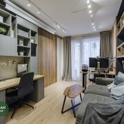 В основной комнате установлено обилие мест хранения + удобное место для make-up (женская половинка оценит) и рабочие зоны. Так же как и в кухне, в шкафах установлена автоматическая подсветка, что позволяет утром не беспокоить вторую половинку.