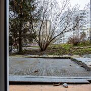 Двор дома огорожен и обеспечивает полную безопасность, имеется зелёная зона для отдыха, детская площадка. Предусмотрены и парковочные места для автомобилей жителей дома. Шлагбаум на въезд во двор.