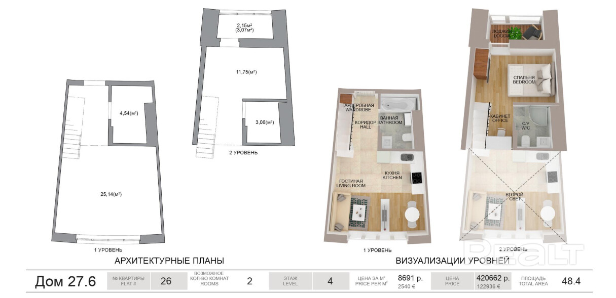 -Антресольный этаж: Каждая квартира имеет антресоль — дополнительный уровень, который идеально подходит для организации кабинета, спальни или мини-спа-зоны. Площадь антресоли не превышает 40% от площади основного помещения.