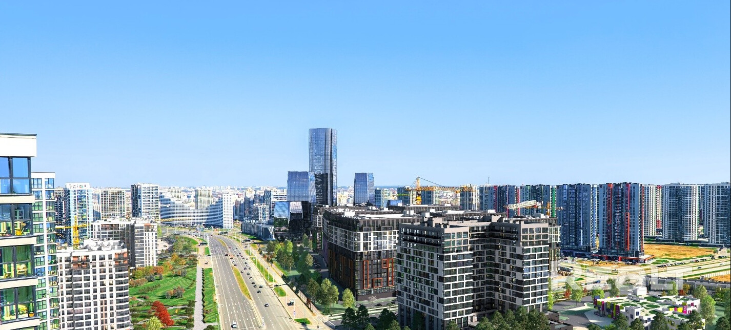 - Широкие улицы между кварталами, спортивные и детские площадки, парковые зоны, парковки, кафе, магазины, банки, детские сады, школы.