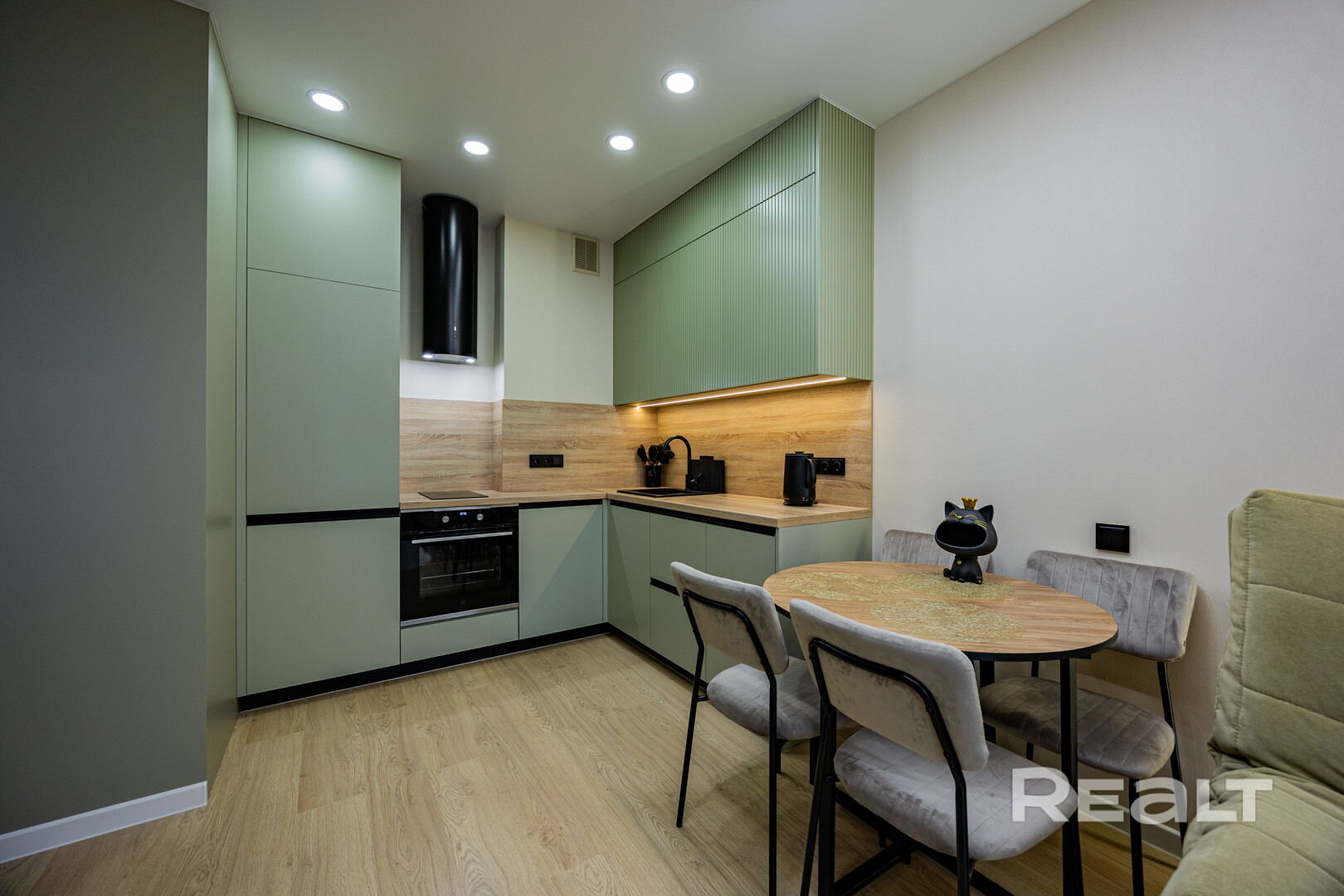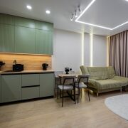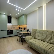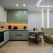 Оборудованная кухня-гостиная со встроенной мебелью и техникой.