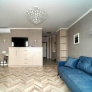 В квартире есть вся необходимая мебель: раскладывающийся качественный диван, итальянский комод/кровать трансформер с ортопедическим матрасом шириной 120, раскладывающийся обеденный стол 80х120, рабочее место с консолью, а также продуманный до мелочей шкаф и кухня. Освещение (Испания), выполнено по зонам.