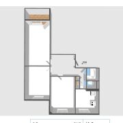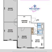 Квартира отличается практичной планировкой – три отдельные жилые комнаты (13,9 кв.м., 12,4 кв.м. и 17,1 кв.м.), раздельный санузел. Общая площадь жилых комнат – 43,4 кв.м. В квартире застеклённая лоджия. Просторная кухня площадью 8,9 кв.м. Высота потолков 2.54 м.