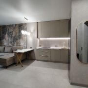 Просторная кухня гостиная со встроеной кухней. Отлично развита инфраструктура: рядом метро, центр города школа, торговый центр Санта с паркингом. Во дворе дома продуктовые магазинчики, стоки, салоны красоты, винные лавки, зоостудии, детские студии, Ozon, Wildberries, и многое другое.