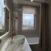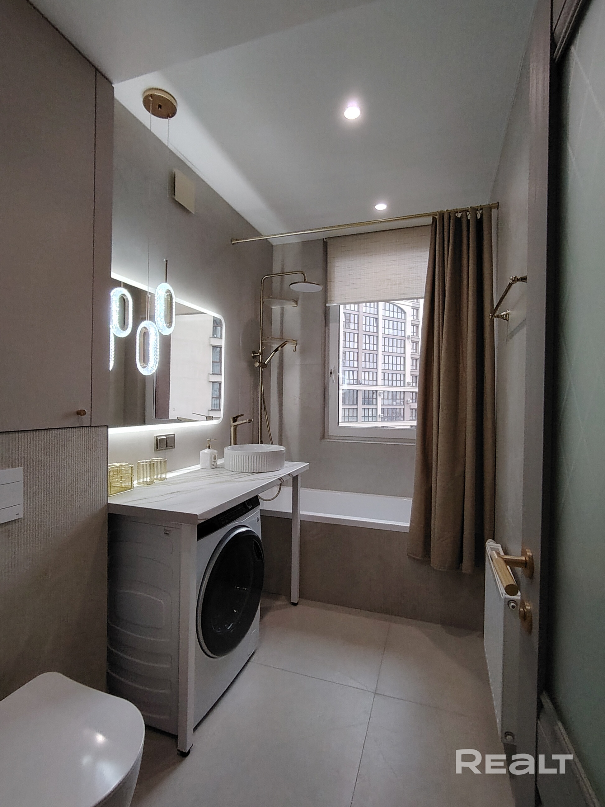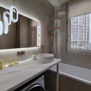 Ванна отделана керамогранитом 80×80, акриловая ванна exelent,  импортный смеситель, бесшумная инсталяция (Испания), змеевик, водонагреватель.