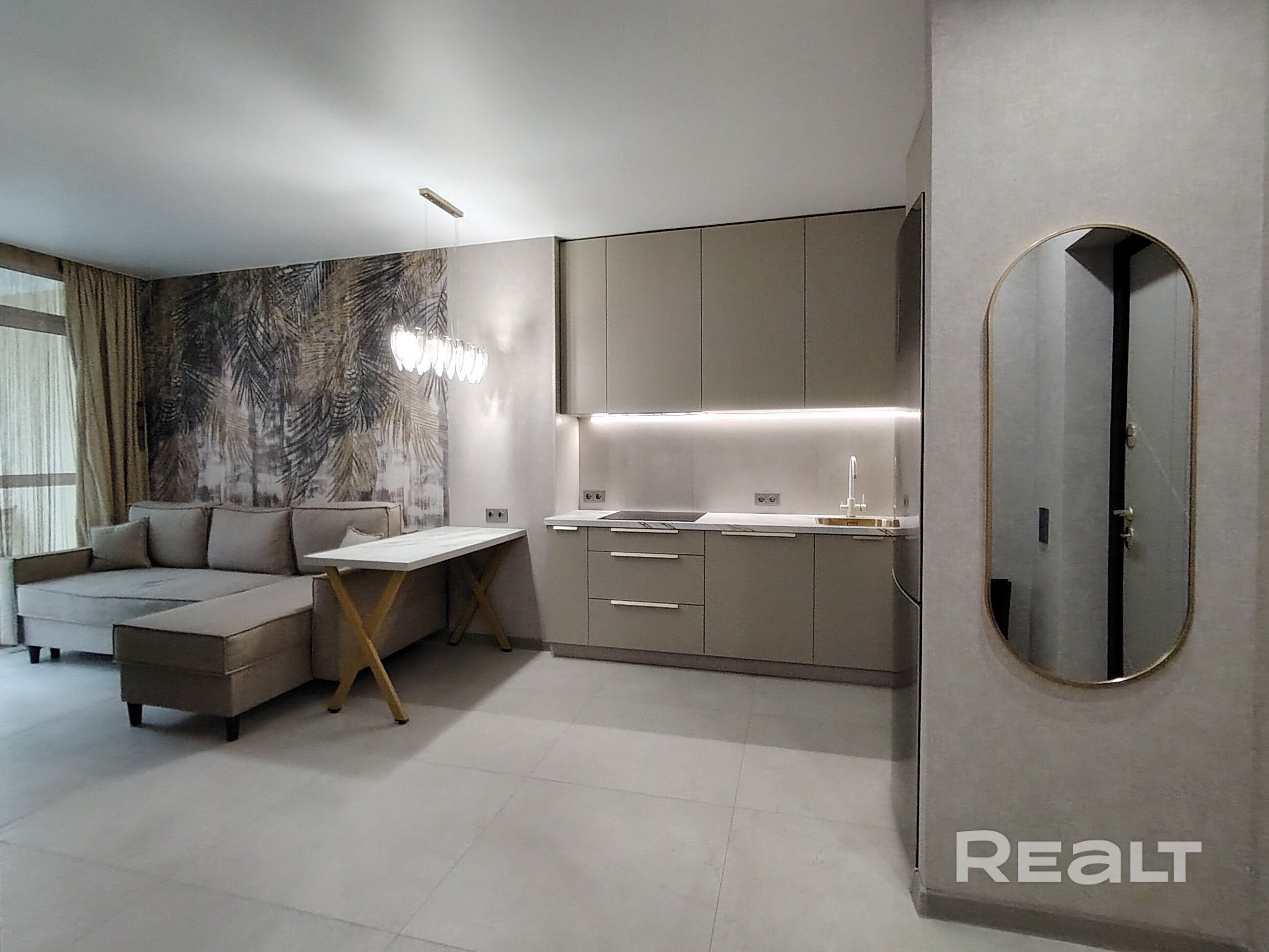 Кухня -гостиная 16 м, на полу керамогранит 80×80.