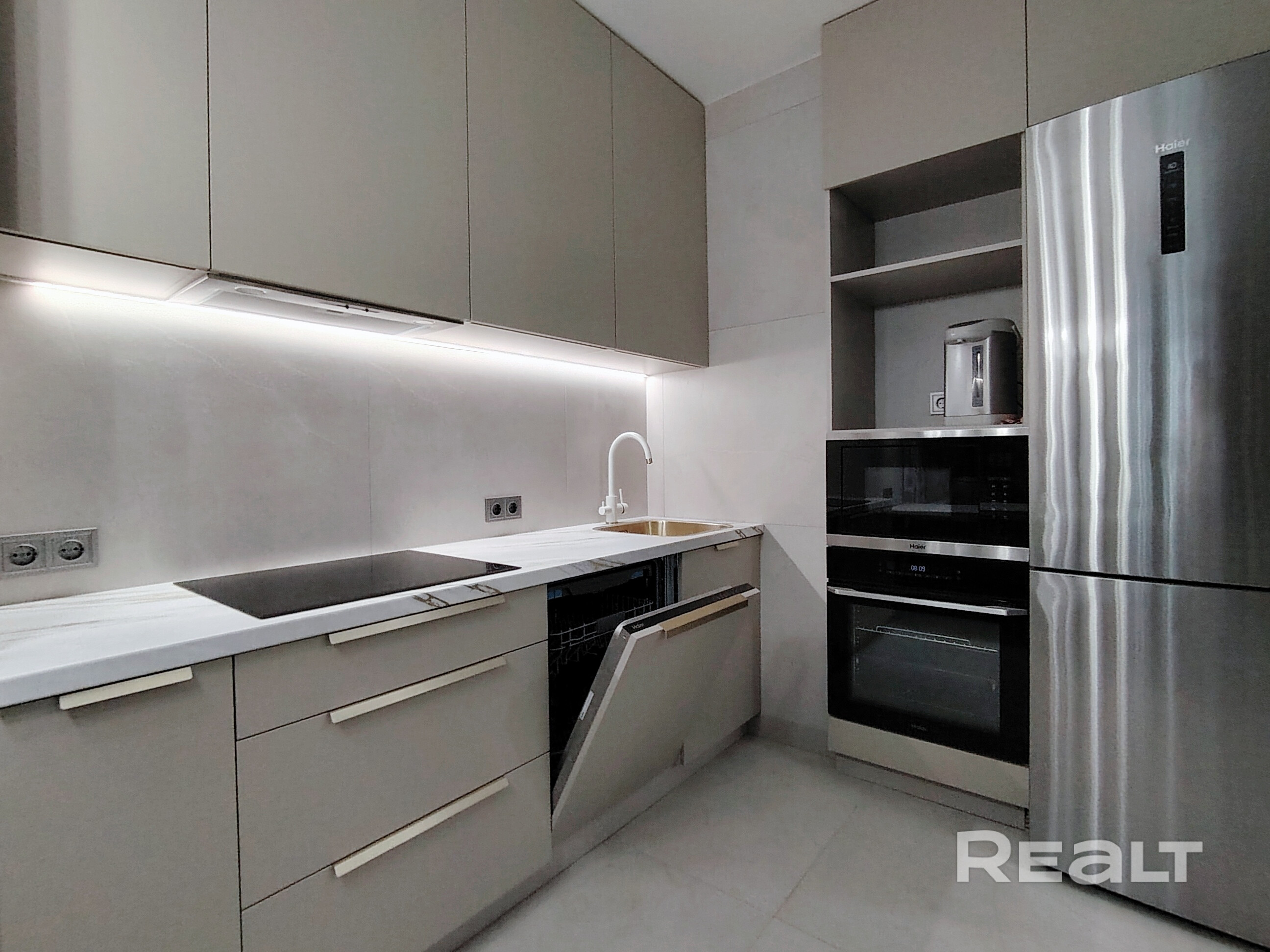 Кухня со встроеной техникой Haier: духовой шкаф, варочная панель, встроеная микроволновая печь, холодильник.