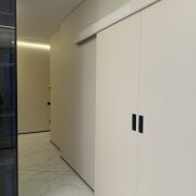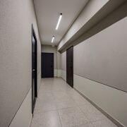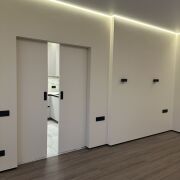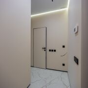 ∙ На полу в коридоре и кухне-гостиной итальянская плитка (теплый пол), стены выровнены и окрашены декоративной краской. Изолирована спальня с гардеробной комнатой. Потолки с теневым профилем, оригинальное освещение, плинтуса скрытого монтажа.