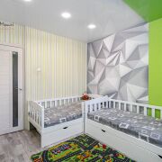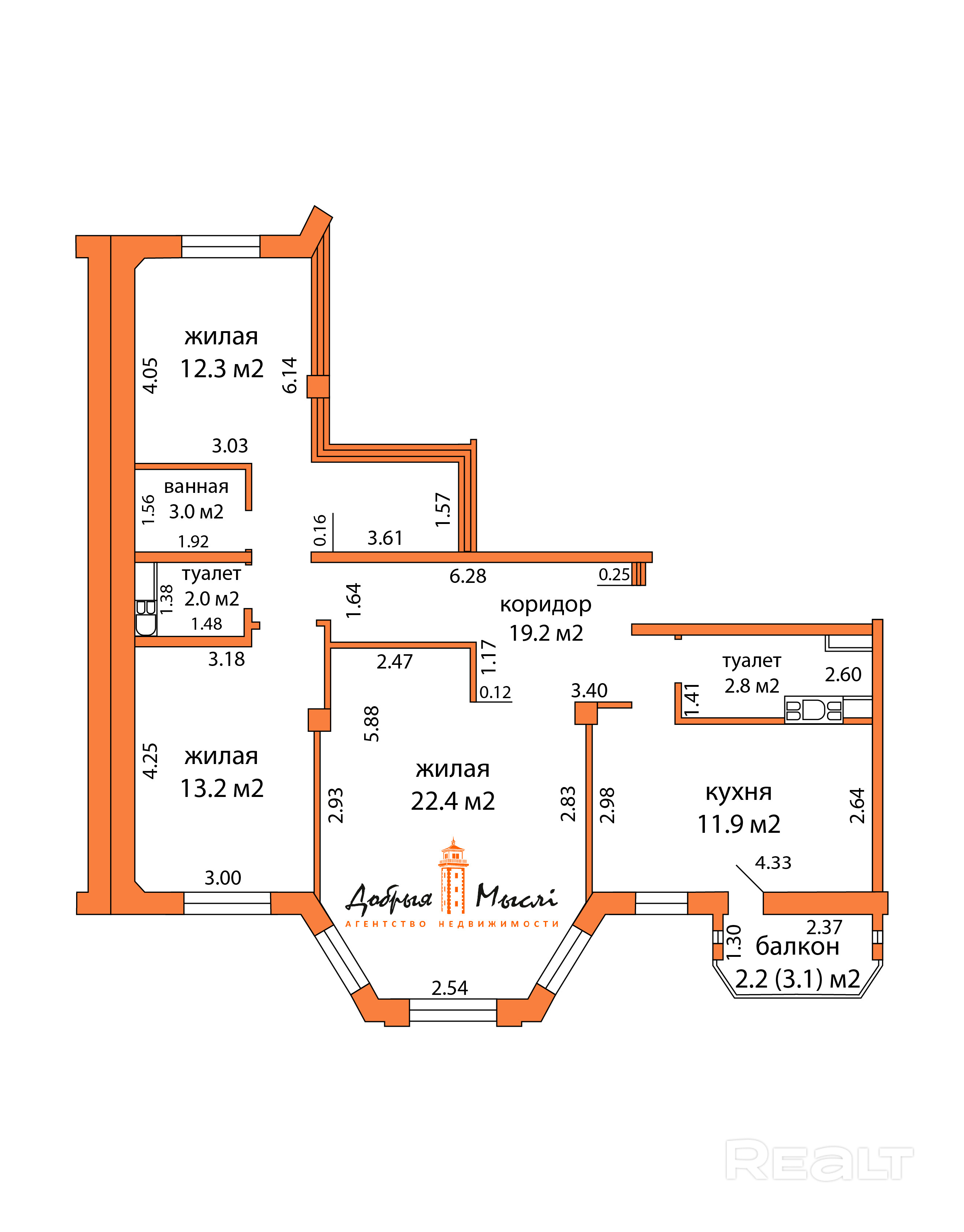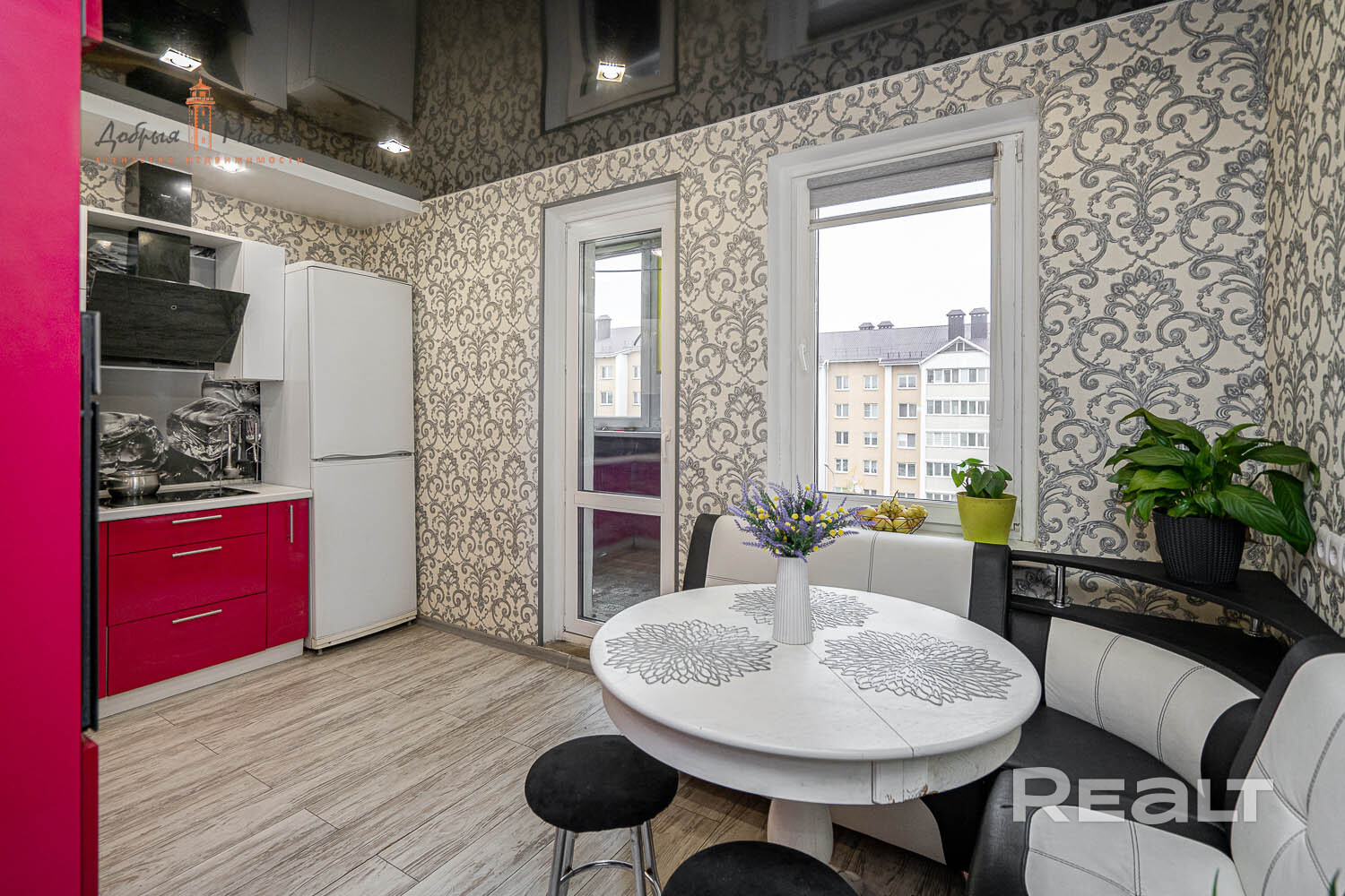 Просторная квартира, окна выходят на северо-западную и юго-восточную сторону. Комната 22,4 кв.м. с эркерным окном. Спальня - 13,2 кв.м., детская - 12,3 кв.м. Кухня - 11,9 кв.м. с застекленным утепленным балконом. Гостевой туалет - 2,0 кв.м., ванная - 3 кв.м., туалет - 2,8 кв.м. Гардеробная - 2,04 кв.м., оборудована всем необходимым для хранения вещей. На полу во всех комнатах - ламинат, в кухне и коридоре - плитка. Туалет и ванная облицованы современной плиткой, с использованием качественных материалов и сентехники. Потолки во всей квартире - натяжные, в комнатах - разноуровневые. Проводка заменена на новую. Стены оштукатурены и оклеены обоями. Все окна в квартире стеклопакеты ПВХ. Металлическая дверь.