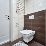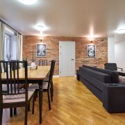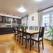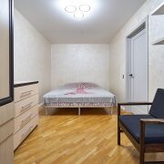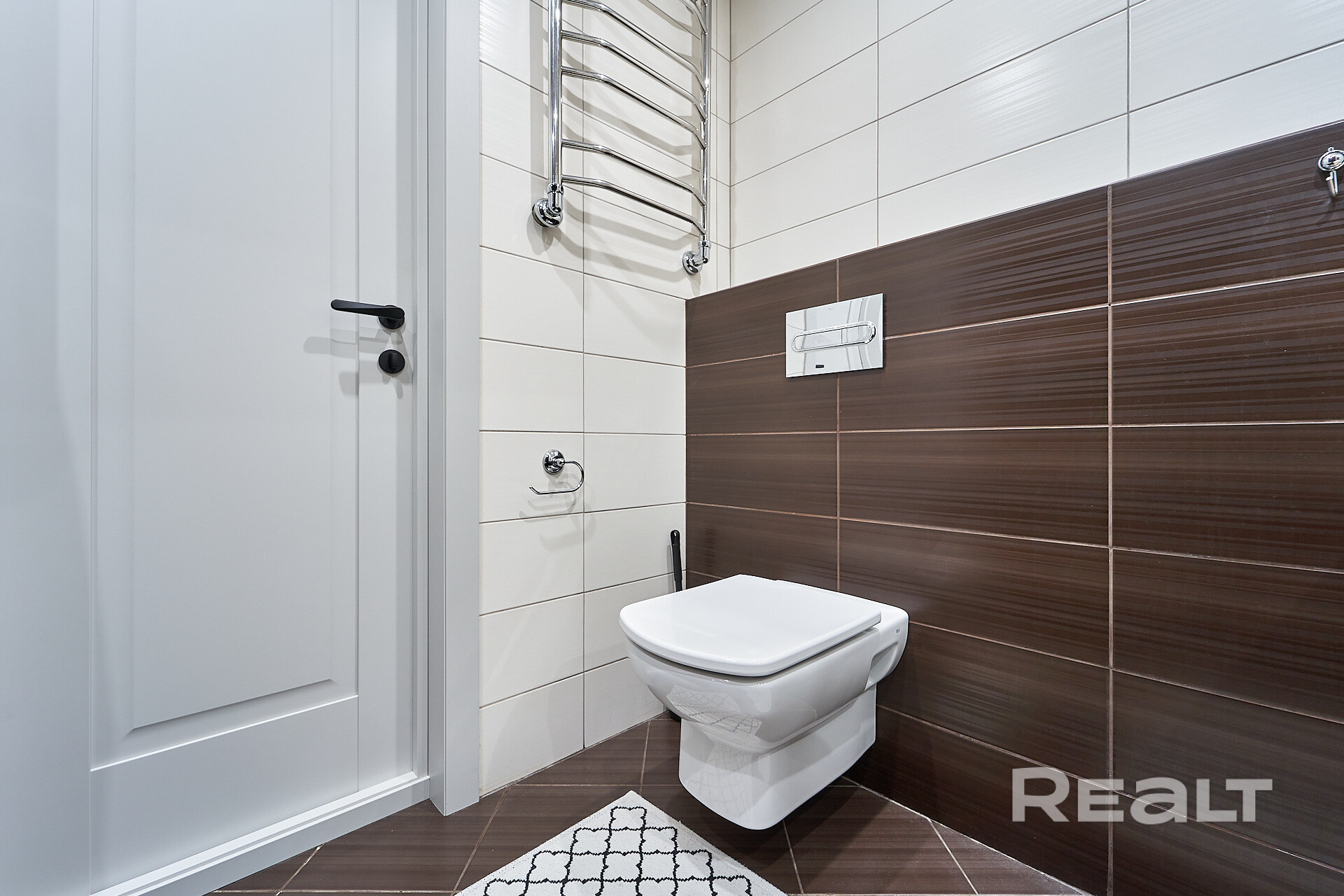 Вместительная кухня порадует новых хозяев различными сценариями освещения, а техника известных производителей будет служить долго и надёжно. Комфорт добавляют такие изобретения инженерной мысли как: индукционная варочная панель, посудомоечная машина, стиральная машина, вместительный холодильник, регулируемый теплый пол под плиткой.