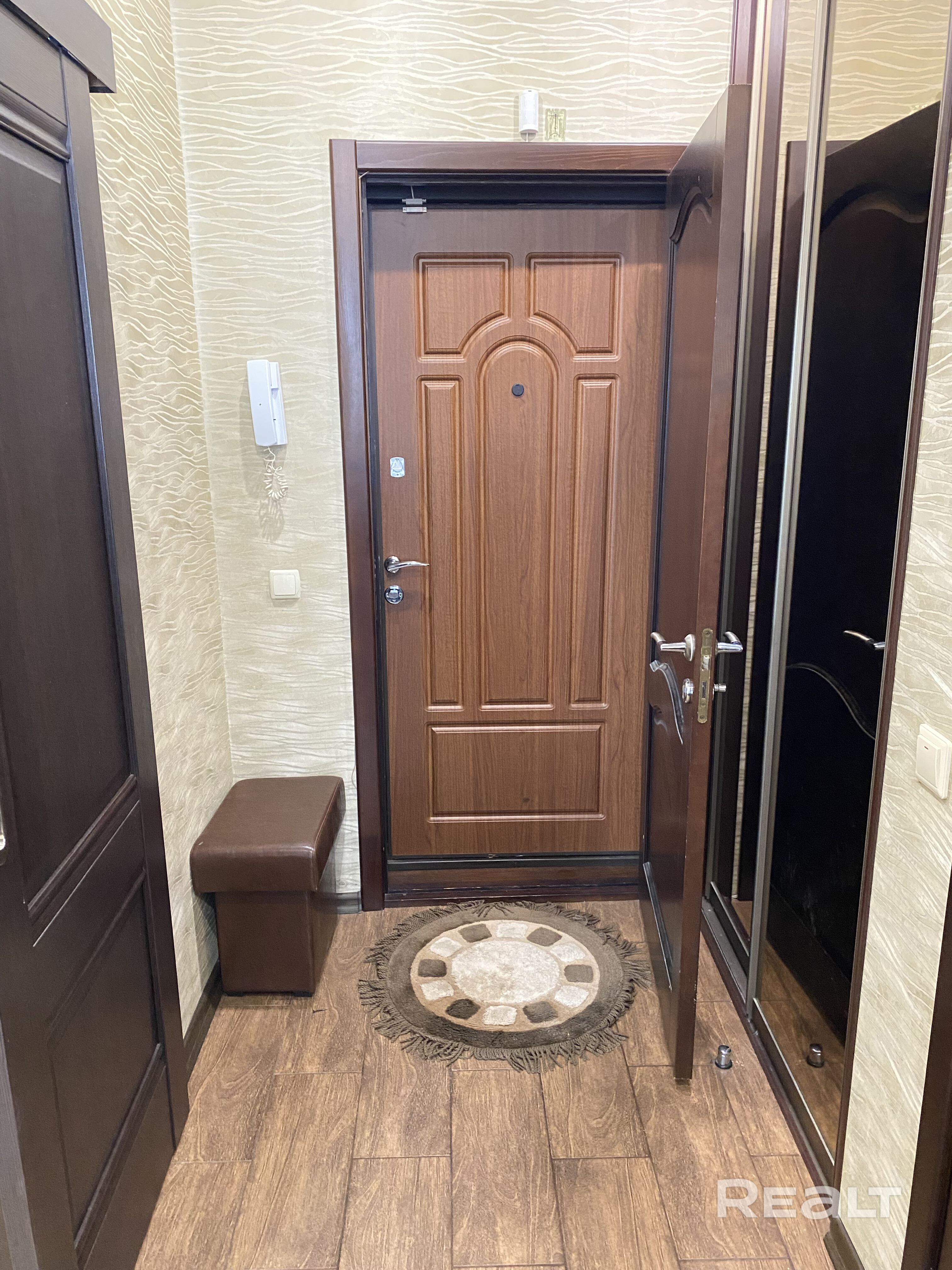 Потолок - натяжной. Коридор оборудован шкафом-купе и удобной тумбой для обуви.