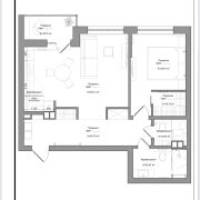 Пространство квартиры разделено на обширную кухню-гостиную с выходом на балкон, спальню с вместительным гардеробом, коридор со шкафами для хранения и 2 сан. узла.