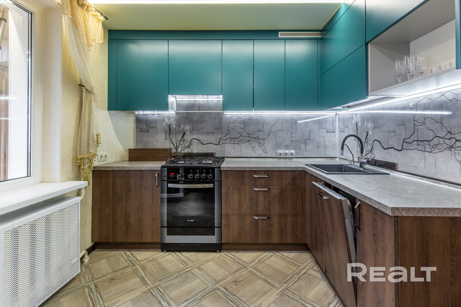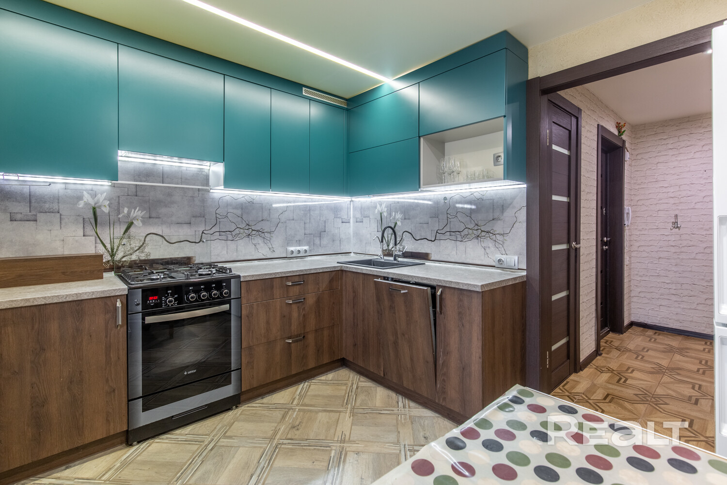 Кухня: 9.1 м2 полностью мебелирована, установлена вся необходимая мебель и техника. Духовой шкаф, газовая панель, посудомоечная машина, вытяжка, имеется место для установки микроволновой печи. Благодаря угловому расположению, у вас остается большое количество рабочего пространства, а это рай для настоящей хозяйки. Площадь кухни и грамотное расположение позволило организовать рабочую зону и зону для приема пищи.