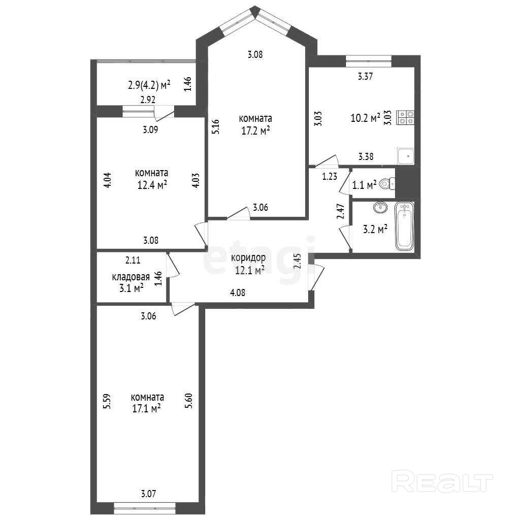 ∙Три спальни, большая кухня, раздельный сан.узел.