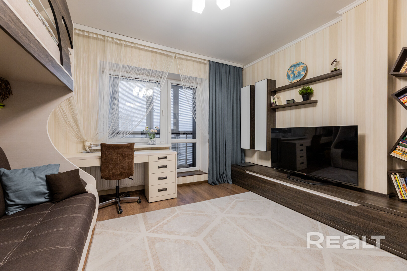 - Просторная комната почти 20 м2 с дополнительной гардеробной: отдельная зона хранения и полноценный рабочий угол — идеальное решение для тех, кто хочет порядок и функциональность без захламления.