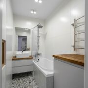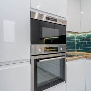 Квартира оснащена встроенной кухней (фасады крашенный МДФ) с современной бытовой техникой: СВЧ встроенная – Whirlpool, духовой шкаф Candy, посудомоечная машина – Electrolux, вытяжка. Отлично зонированная жилая комната с зоной для сна, гостиной и детской.