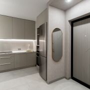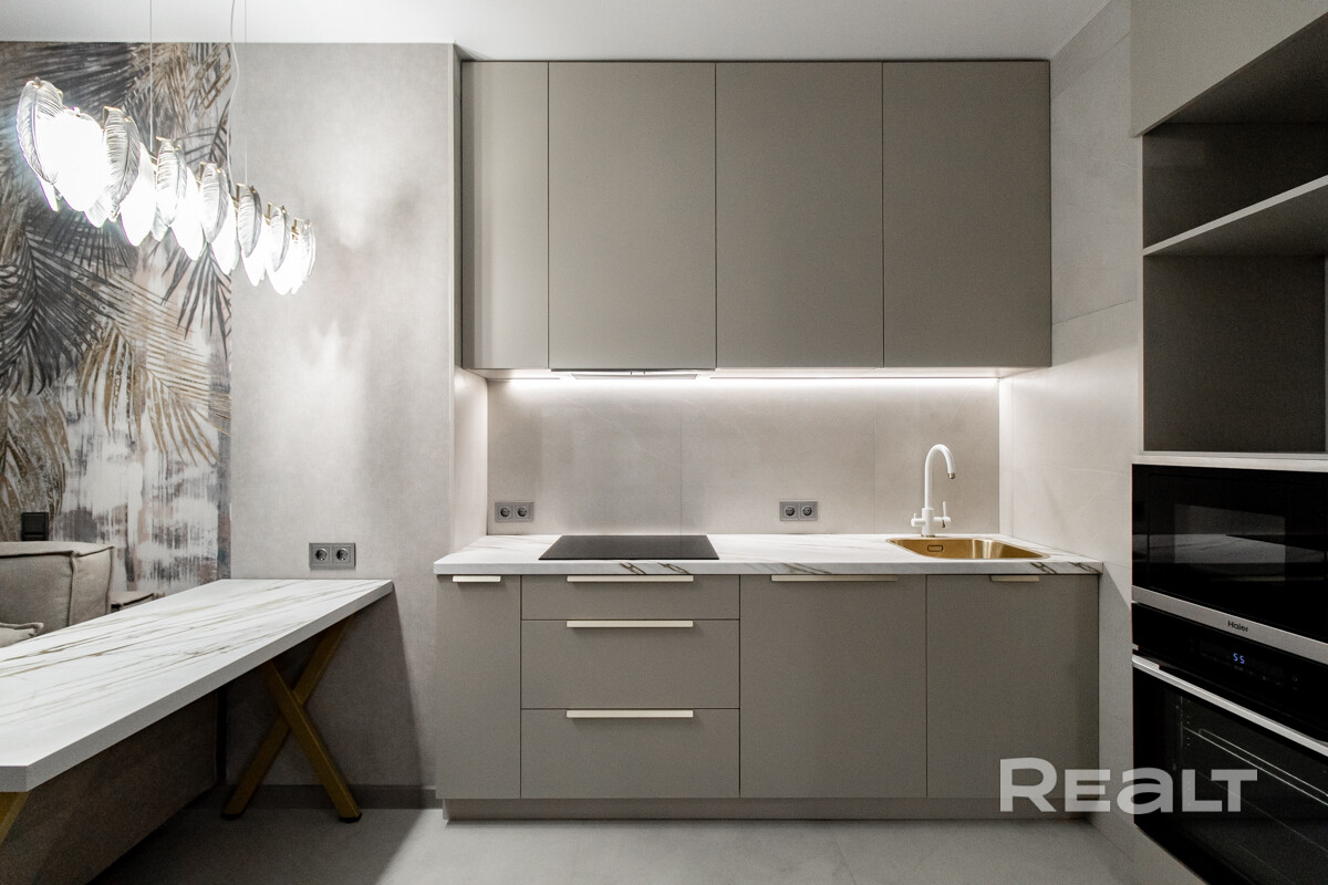 Кухня со встроеной техникой Haier: духовой шкаф, варочная панель, встроеная микроволновая печь, холодильник.