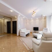 Ремонт выполнен из современных, дорогостоящих импортных материалов. Квартира оборудована всем необходимым для комфортного проживания: удобные кожаные диваны, кухонная техникаBosch, (холодильник, духовой шкаф, электрическая варочная панель, стиральная машина), мощный кондиционер, вместительные шкафы для хранения вещей, высокоскоростной интернет (оптоволокно), видеодомофон, все полы в зоне с плиткой с подогревом, межкомнатные двери из массива с итальянской фурнитурой.