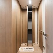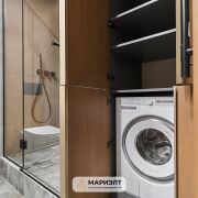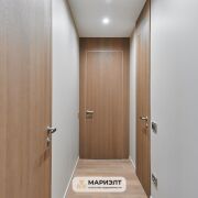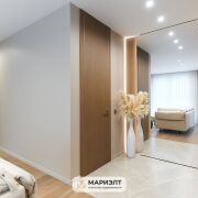 Проект квартиры изготовлен известными дизайнерами г.Минска. В квартире: мебель изготовлена по индивидуальному проекту компанией Domani из шпона дуба+ керамогранит Inalco (премиум Испания). Дери изготовлены компанией Lazio. Паркет на полу. В сан/узле + пол керамогранит, фуга эпоксидная, сантехника встроенная, инсталляция TECE (Германия), встроенный трап в плитку. В квартире предусмотрено несколько режимов освещения со скрытыми Led подсветками в мебели. Мастер-выключатель.