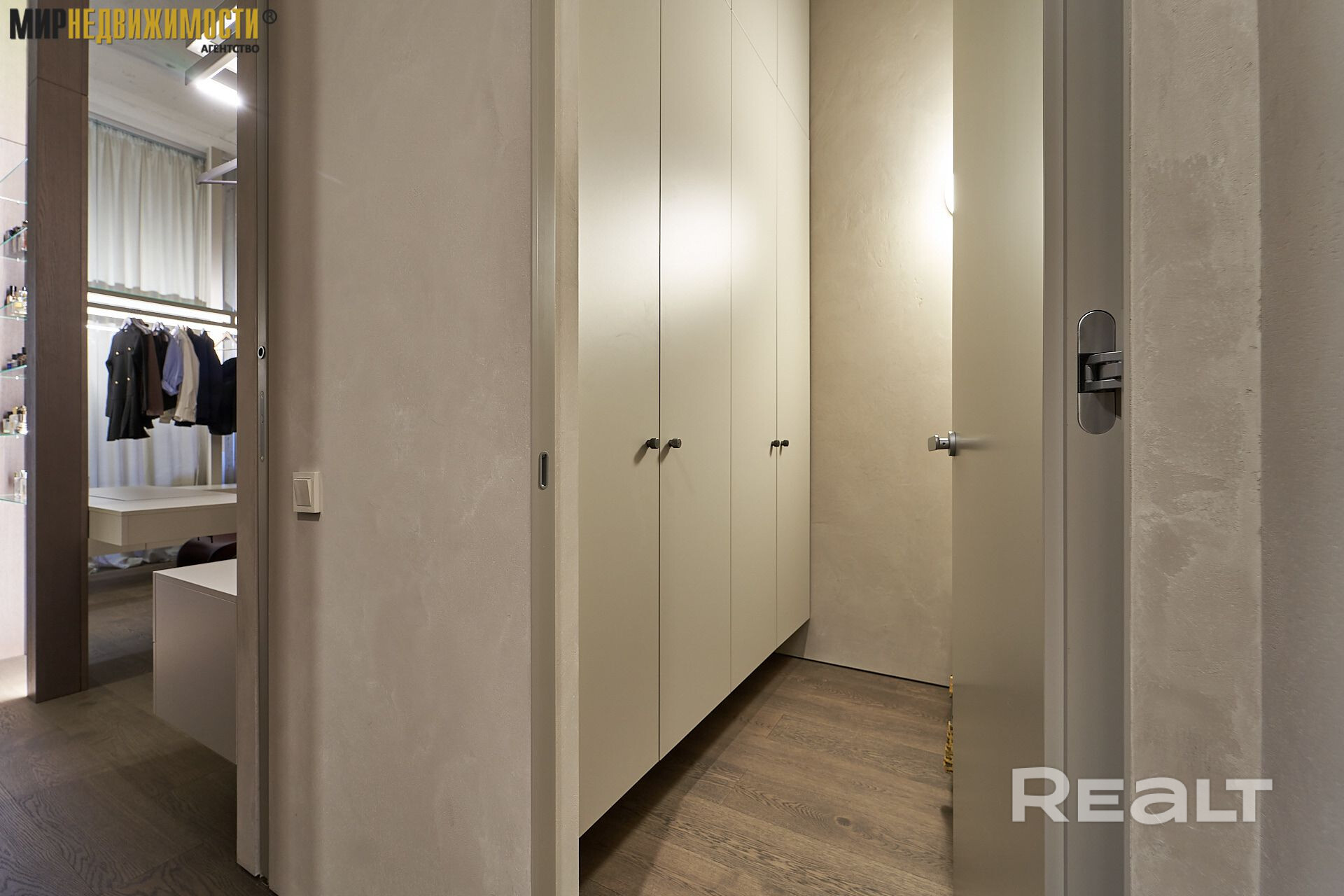 Стены покрыты декоративной штукатуркой и микроцементом, создающими глубину и фактуру.