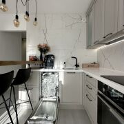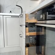 Дубовая кухня Yavid, фурнитура Blum, столешница из акрилового камня, посудомоечная машина Bosch, духовой шкаф и индукционная панель Siemens, холодильник Samsung silence, встроенная микроволновая печь, скрытая вытяжка, встроенный фильтр для воды. Стиральная машина Electrolux. Гардеробная оборудована системой хранения, которую легко трансформировать под нужную высоту полок.