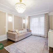 Продуманное планировочное решение – выделены две отдельные комнаты, одна из которых мастер-спальня (со своим санузлом и просторной гардеробной), функциональная детская, уютная гостиная с телевизионной зоной, кухня с выходом на застекленную лоджию, имеется второй санузел с ванной и просторный коридор.