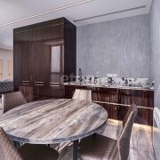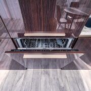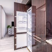 Кухня – лакированный шпон. Столешница – натуральный бразильский мрамор. Доводчики Blum. Встроенный холодильник, посудомоечная машина, стационарный фильтр для воды.