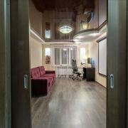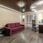 Квартира имеет грамотное планирование и панорамный вид, что создаёт ощущение простора. Площадь кухни 9 м2, есть застеклённая и утеплённая лоджия с подогревом пола. Напольное покрытие выполнено из качественного ламината и плитки.