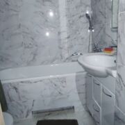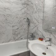 В квартире оборудован полноценный санузел, площадью 5 кв.м, с ванной, унитазом, раковиной и электрическим водонагревателем Timberk, пол и одна стена в санузле имеют электрический подогрев. Новая электропроводка, окна ПВХ. Полы – доска + линолеум, стены выровнены + обои, потолки – гипсокартон + краска,в санузле подвесные. Стены в коридоре обшиты деревянной вагонкой. Входная дверь в квартиру металлическая.