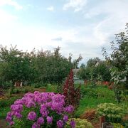 На земельном участке рядом с квартирой растут яблони, вишня, цветы, земля плодородная.