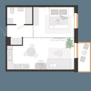 Востребованная планировка-просторная кухня-гостиная (21.6м) с выходом на балкон и изолированная спальня (12.9м).