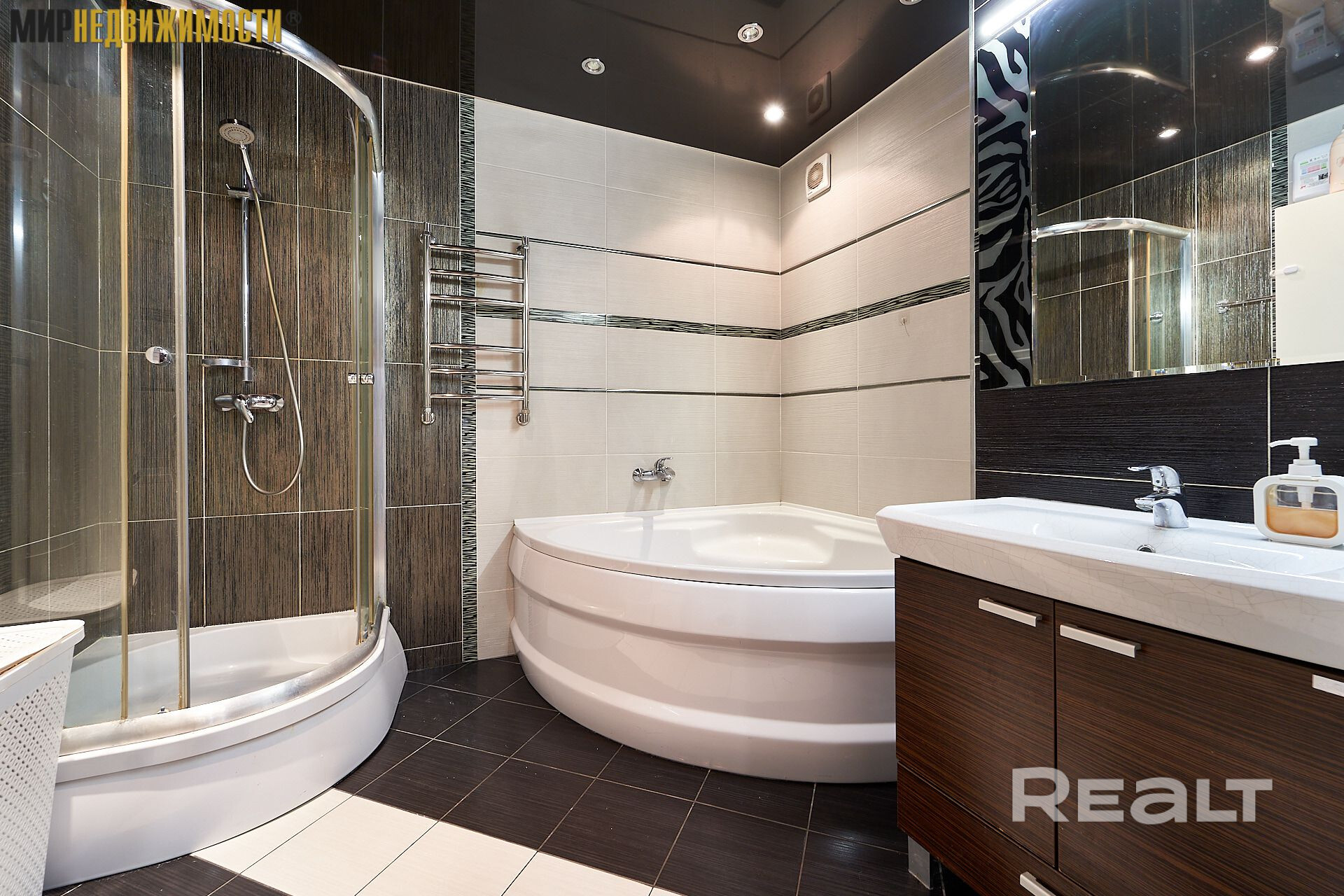 Санузел облицован импортным кафелем. Установлена угловая акриловая ванна, душевая кабина, умывальник с тумбой с местами хранения.
