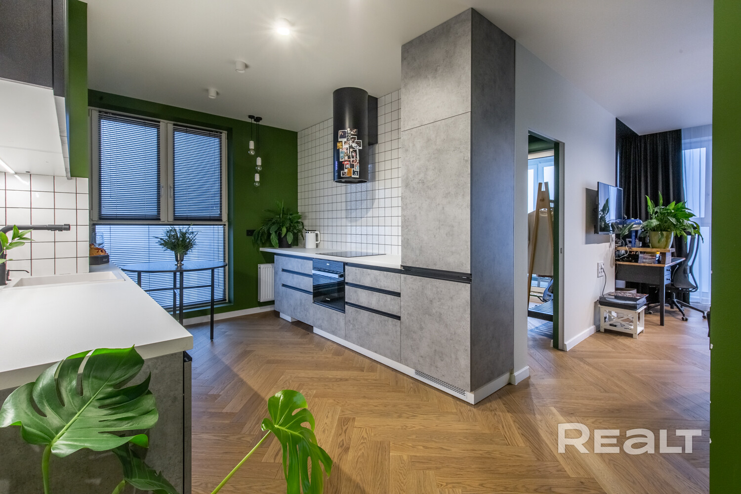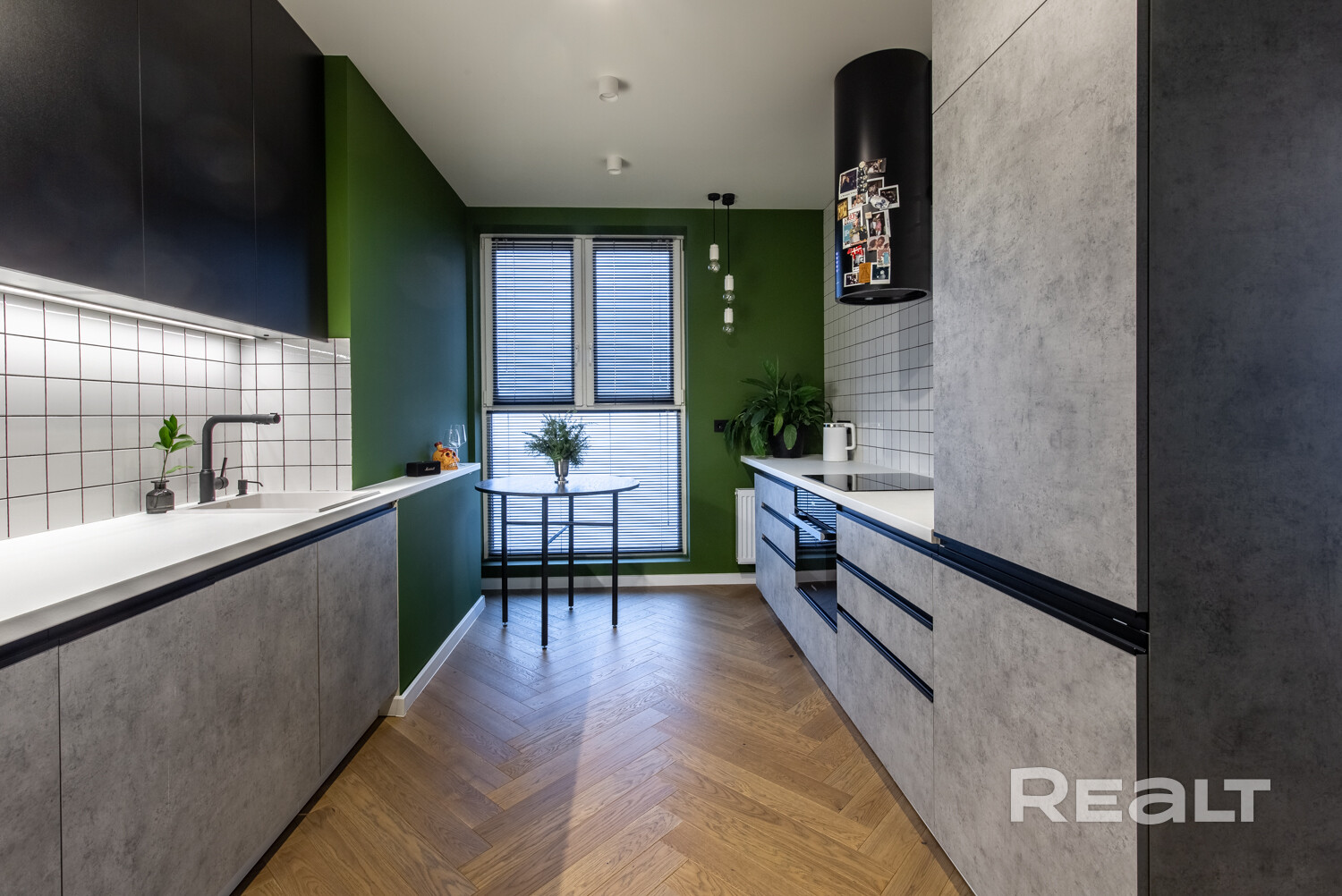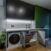 Просторная кухня оборудована всей необходимой бытовой техникой: встроенный холодильник, стиральная машина с функцией сушки Haier, посудомоечная машина, стеклокерамическая варочная поверхность, духовой шкаф с функцией СВЧ, вытяжка – Maunfeld, фильтр для питьевой воды.