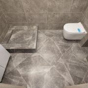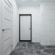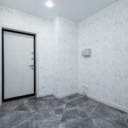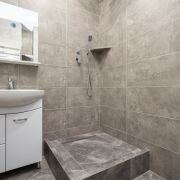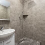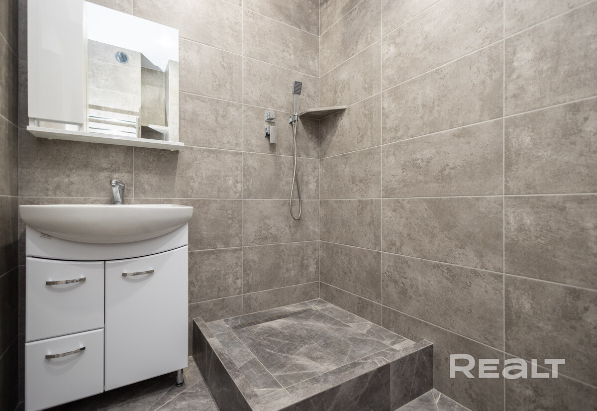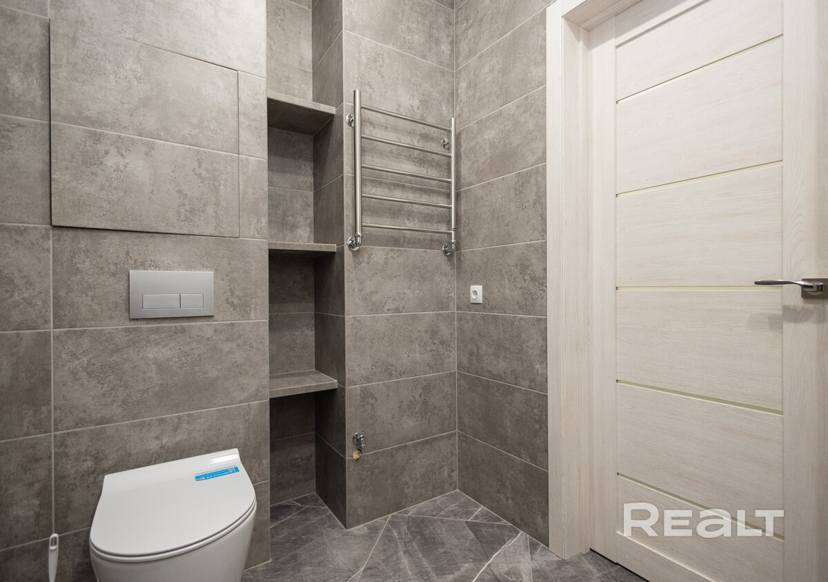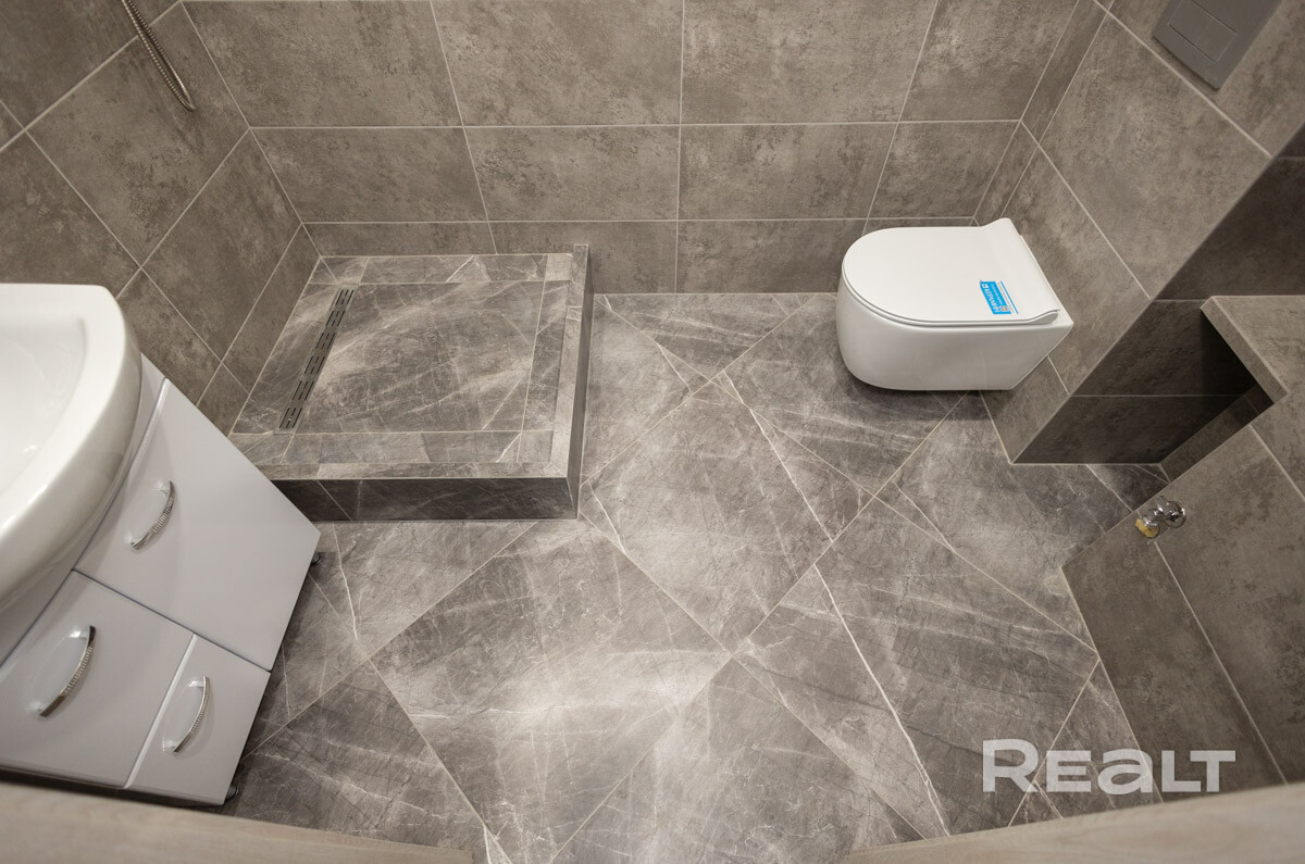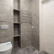 Пол — плитка с подогревом, потолок натяжной. Разведена электрика по всем стандартам