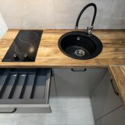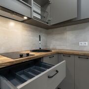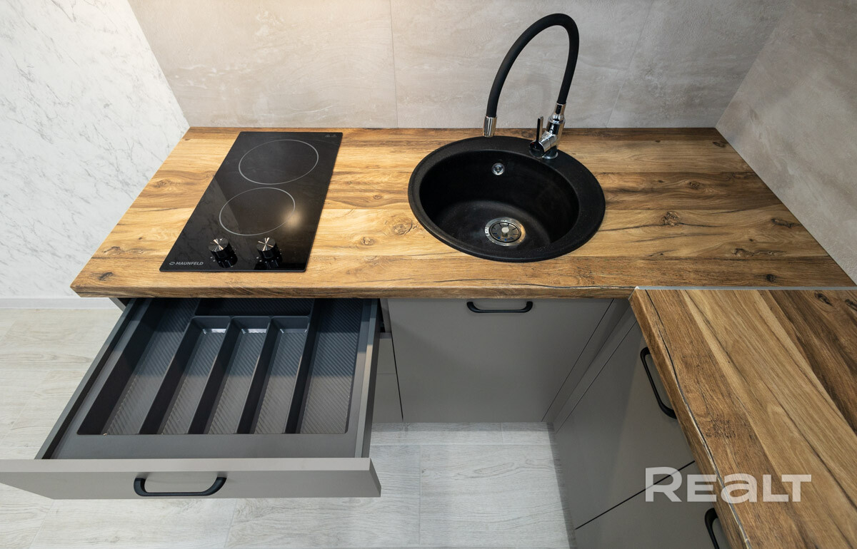 Встроенная кухня с техникой (варочная панель, вытяжка).