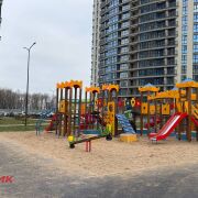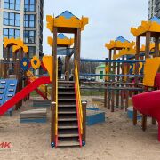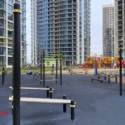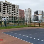 Во дворе — зелёная зона без машин, оборудованные детские площадки, теннисные корты и тренажёры для занятий спортом.