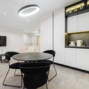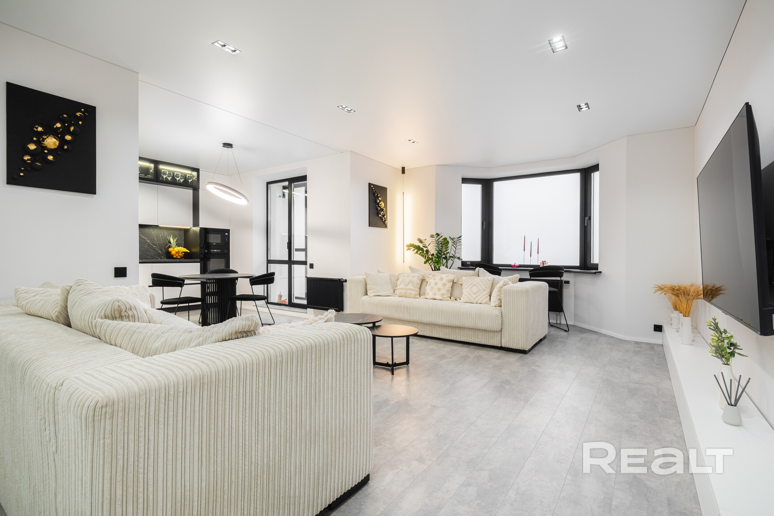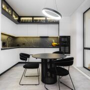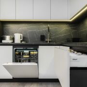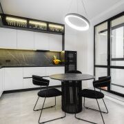 Современный стильный кухонный гарнитур с фурнитурой Blum оборудован всей необходимой для комфортной жизни техникой бренда Weiissgauff – встроенные духовой шкаф, микроволновая печь, индукционная варочная поверхность, вытяжка, посудомоечная машина; встроенный холодильник; фильтр для питьевой воды с трехступенчатой системой очистки.