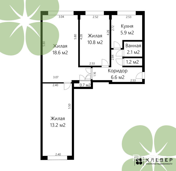 Комнаты – 18,6 м2, 13,2 м2 и 10,8 м2.