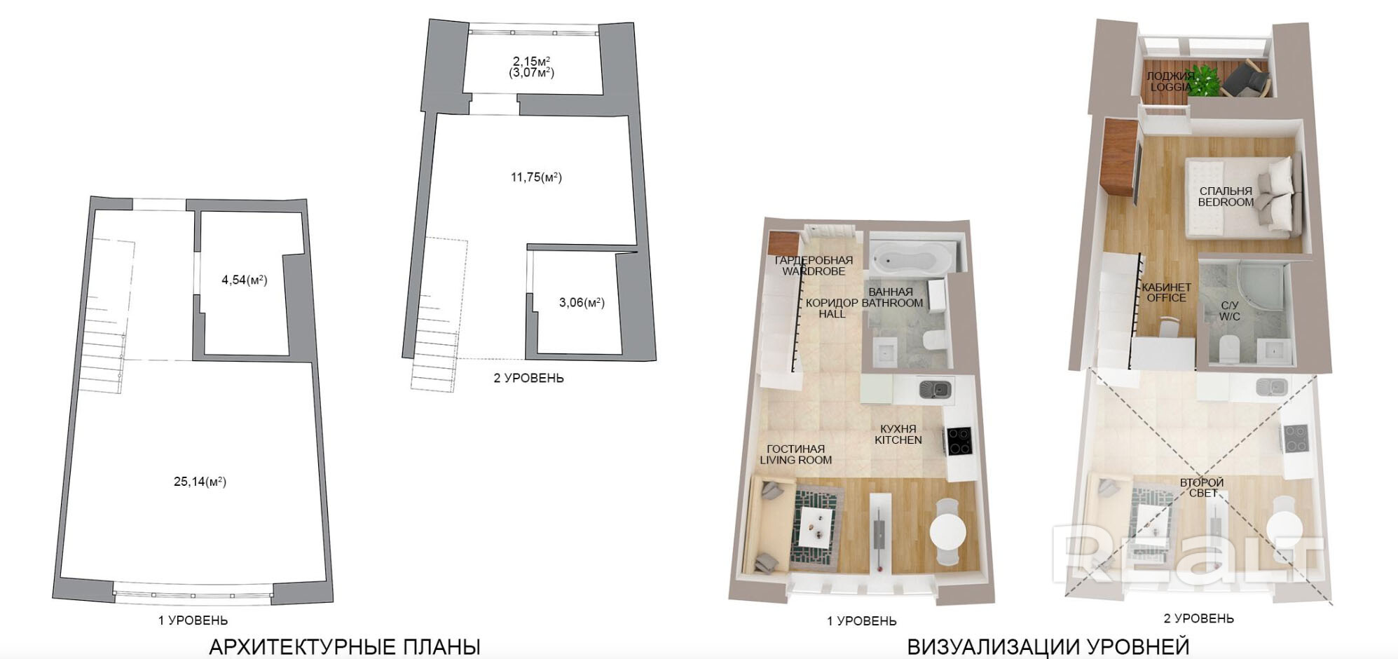 - На верхнем уровне - выход на остеклённый балкон повышенной высоты.