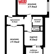 Общая площадь по СНБ — 60,9 м2, жилая — 35,8 м2, кухня — 9,0 м2.