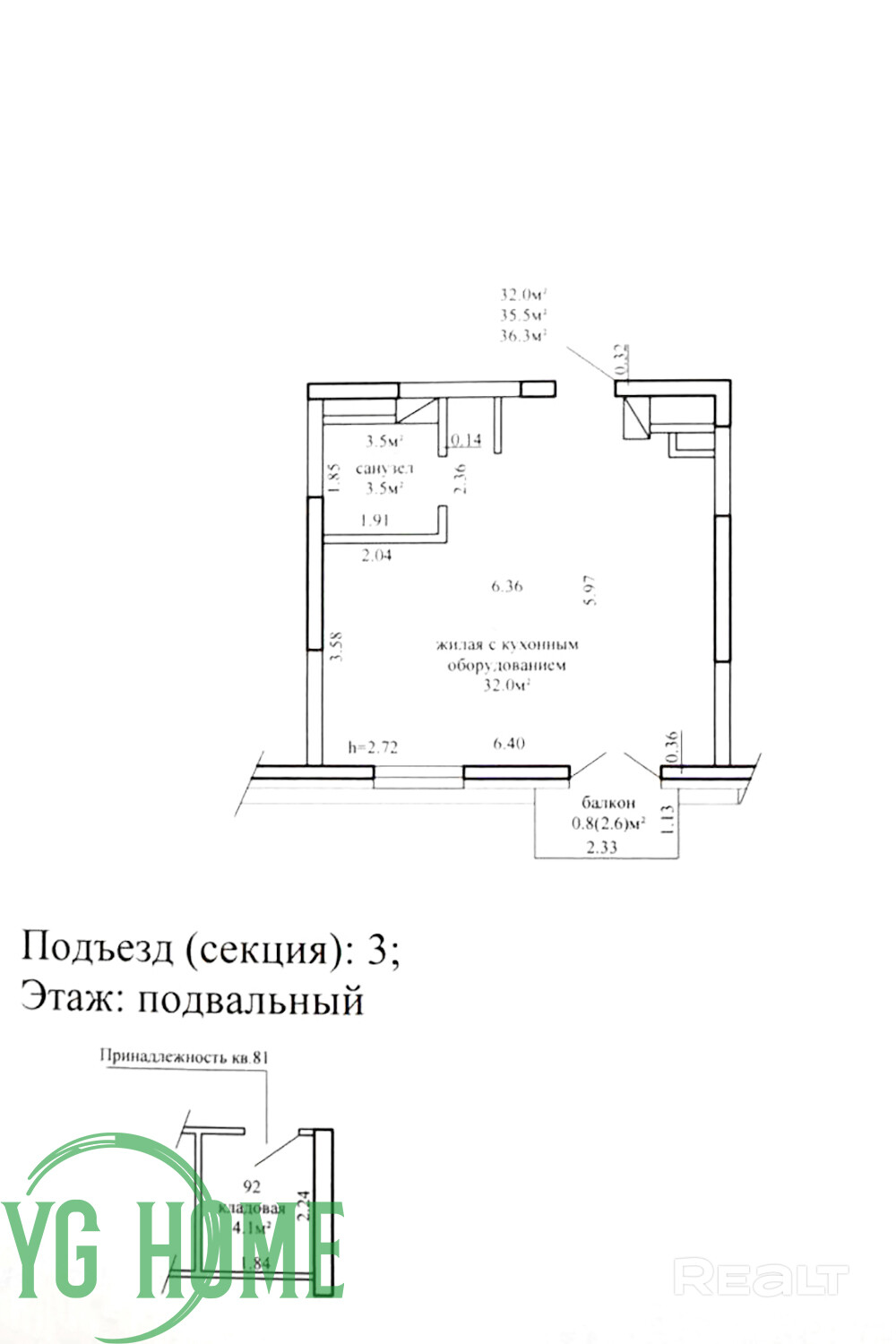 36.3м2 по СНБ (35.5общая), 32м2 жилая
