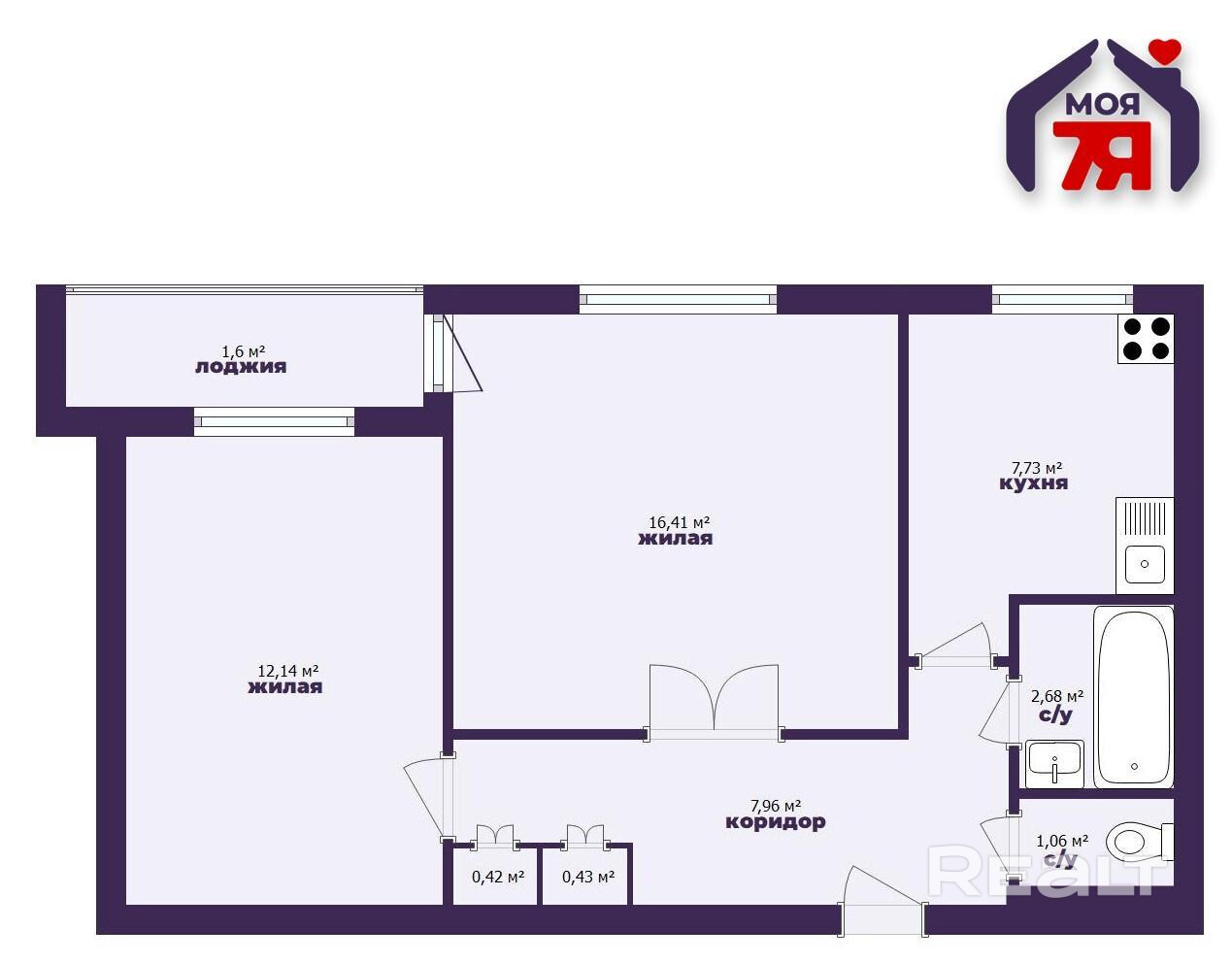 - Удачная планировка. Жилая площадь (28,55 кв.м.) состоит из двух раздельный жилых комнат. В одной из них Вы можете обустроить детскую комнату.