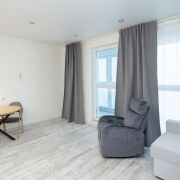 В квартире установлены окна ПВХ панорамные , металлическая входная дверь. На полу частично в прихожей и в санузле плитка, в комнате - ламинат. Высокие потолки- 2.7м, много подсветки разных зон.