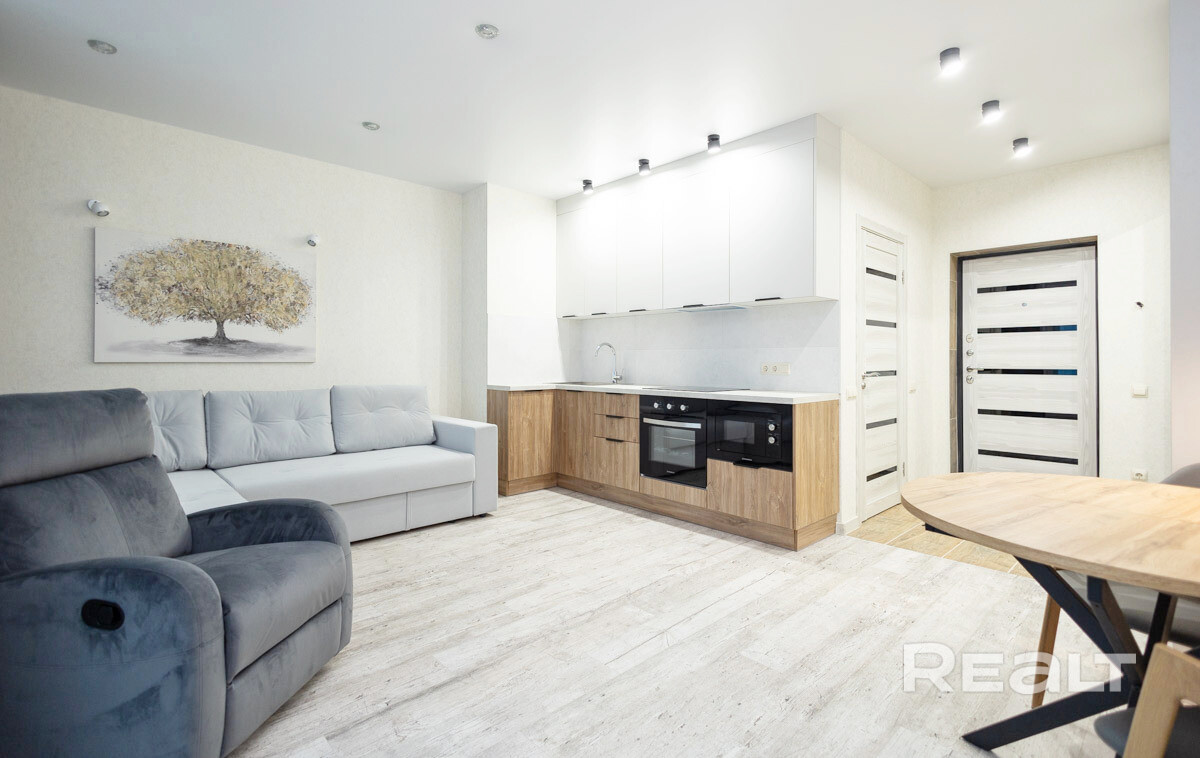 Мебель и техника остаются : Встроенная кухня с фасадами самой модной цветовой гаммы холодильник, стиральная машина, микроволновая печь, диван.