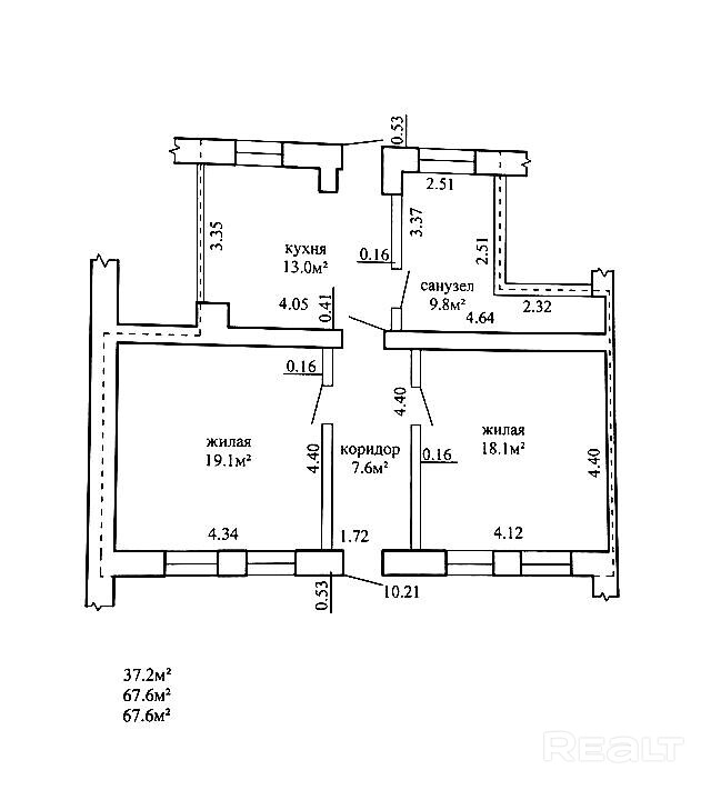· Жилая: 37.2 м2 (комнаты 19.1 + 18.1 м2)