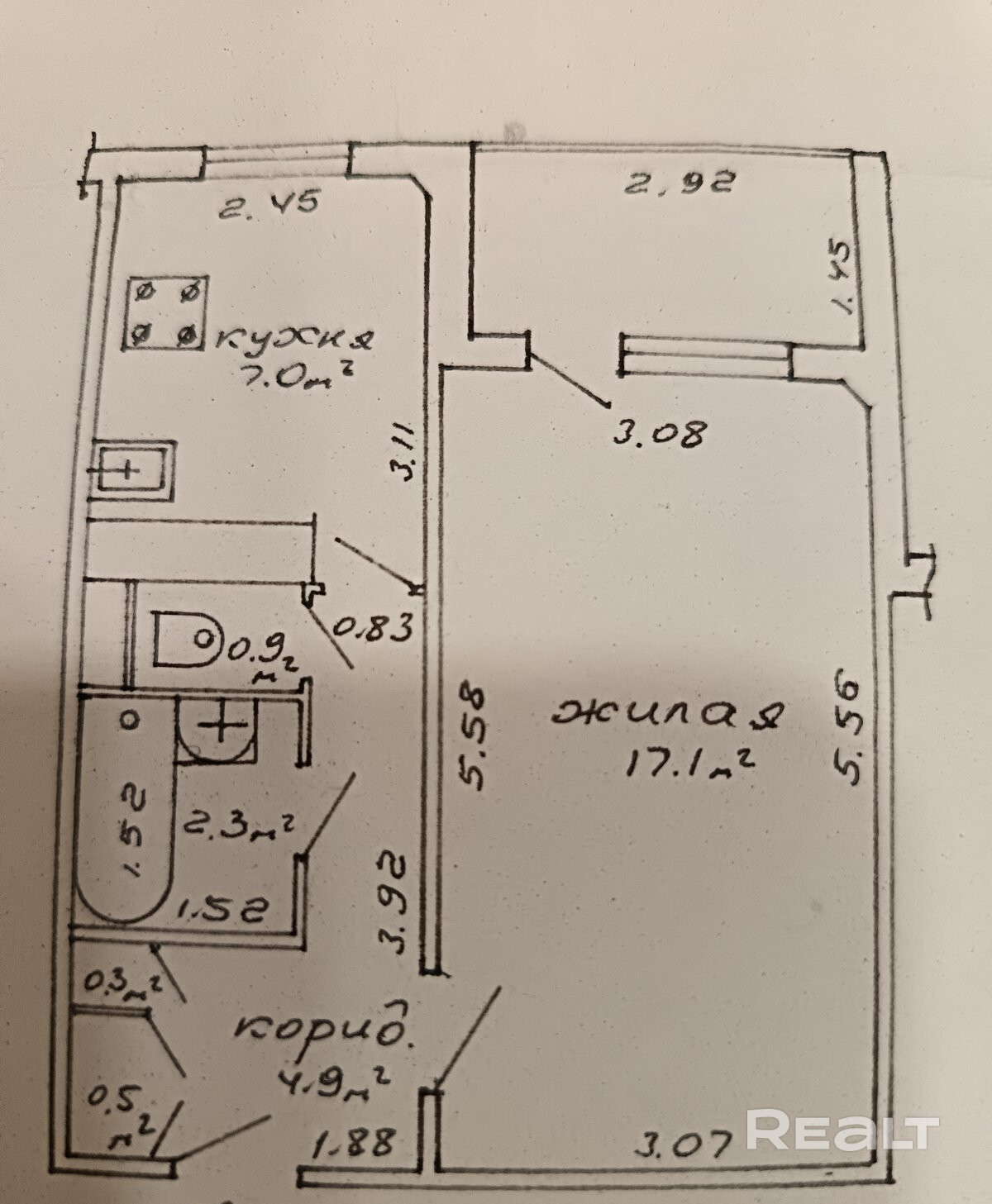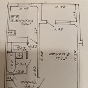Комната 17 м., кухня 7 м, раздельный сан.узел, коридор 5 м.