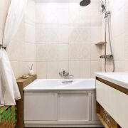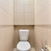 В санузелеполная замена кранов, труб, соединений от стояка. Плитка «Керама марацци» (РФ/Италия) коллекция «Сорбона» 25*40, дорогие штучные декоры, подрезка под 45, керамогранит Haru Tan 20*120 (Испания).