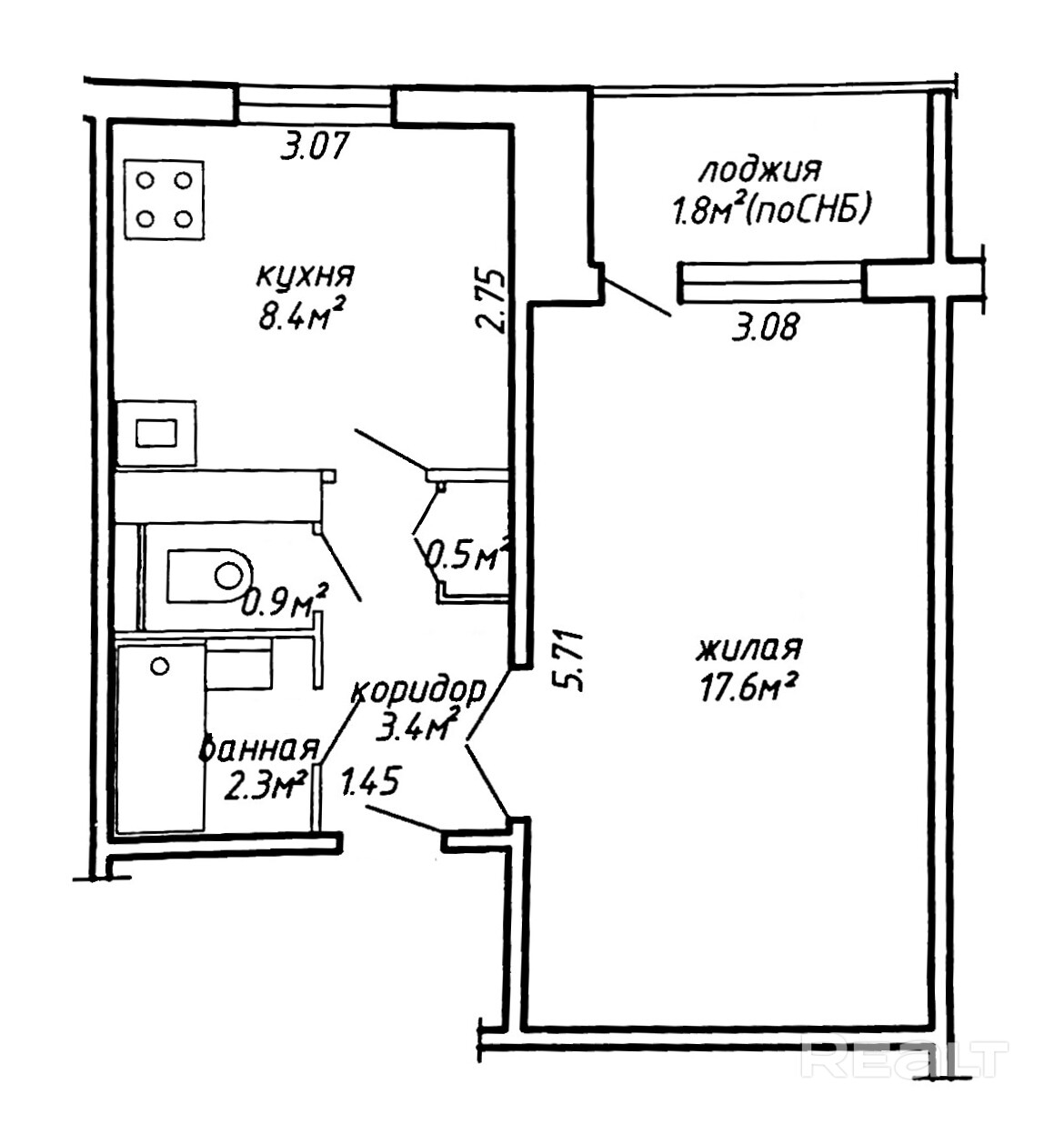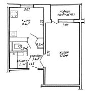 Удачная планировка: просторная комната 17,6 м2 с лоджией, большая кухня 8,4 м2, вместительный коридор.